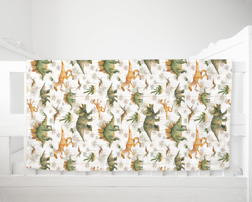 This beautiful soft fleece baby blanket features earth toned dinosaurs in greens and oranges on a white background. The blanket measures 100 cm x 73 cm.
