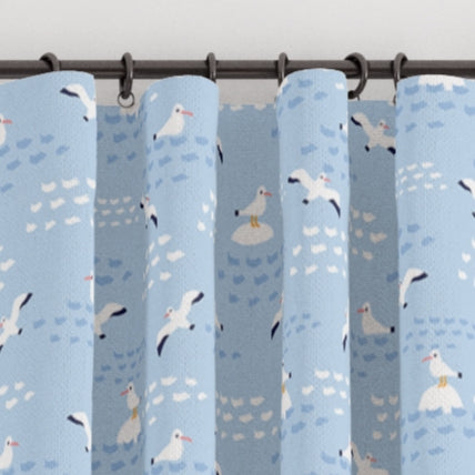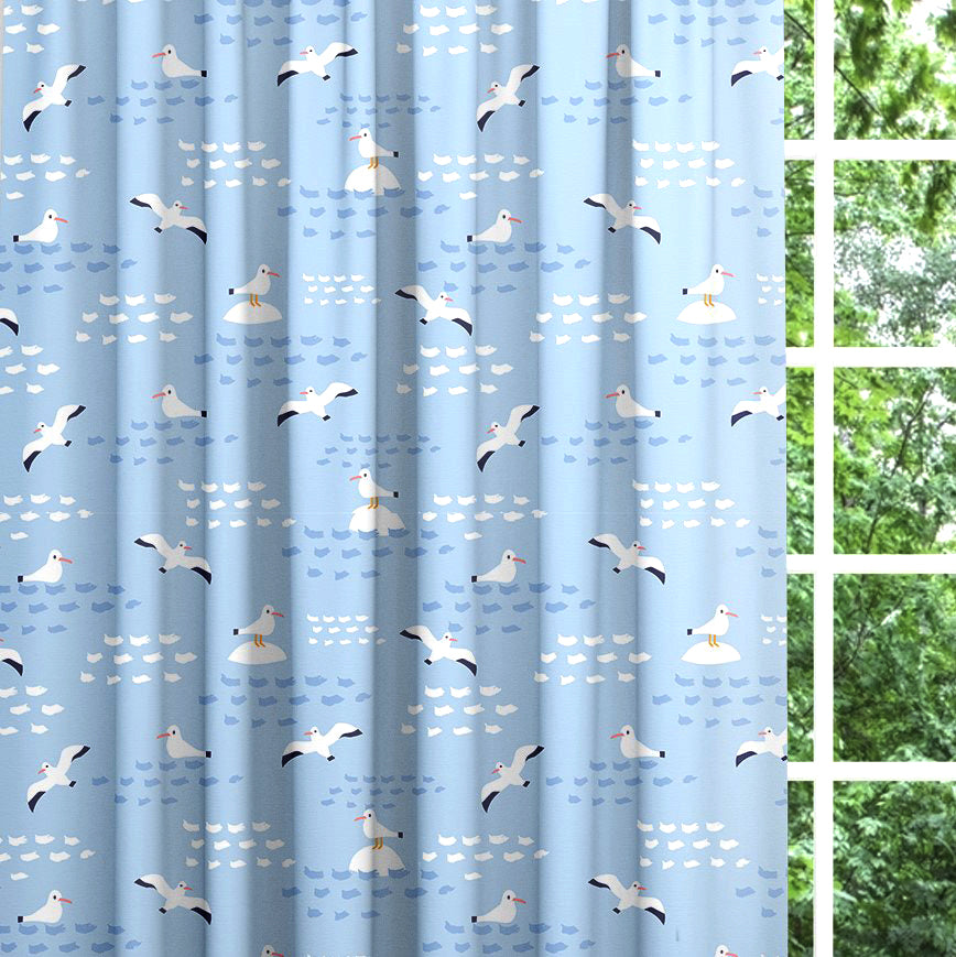 Blackout lined children's bedroom and nursery curtains featuring seagulls on a blue background.